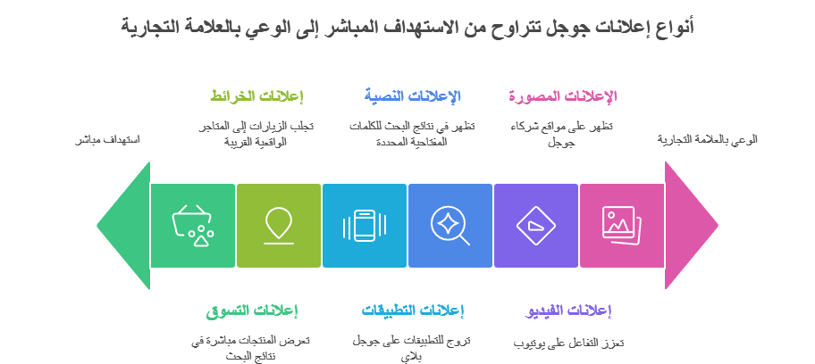 توفر اعلانات جوجل مجموعة واسعة من الخيارات التي تلائم جميع الأهداف التسويقية، سواء رغبت في زيادة الزيارات أو رفع المبيعات أو تعزيز الوعي بالعلامة التجارية، وفهم انواع اعلانات جوجل يساعدك على اختيار النوع الأنسب لحملتك وتحقيق أفضل عائد على الاستثمار.